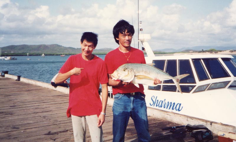 Steve with Bill's golden trevally standing on the Cooktown pier, Cooktown was around 4-5 hours drive along the coastal route from Cairns on dirty roads after Port Douglas in 1990 or 1991